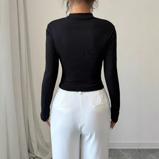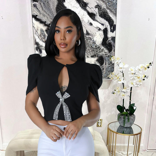 T-shirt à manches bouffantes et fermeture éclair en strass